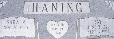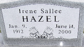 | HAZEL, Irene (SALLEE) | Jan. 9, 1912 | June 14, 2000 | Research Note: She was the daughter of Charles and Clara Sallee. Irene Sallee, of Exeter, MO age 27, married John Hazel of Wheaton, MO age 25, on Feb. 12, 1939 in Benton Co., AR. | AR Marriage Index Census Phyllis Long Photo Fred and Neoma Sherman |