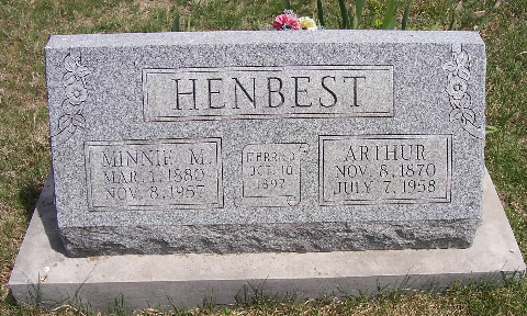 SSW: Minnie - Inscription: "Married Oct. 10, 1897" - Research Note: He was the son of William J. and Betty (Jones) Henbest. - Cassville Democrat, Nov. 1, 1945 - LAST RITES FOR ARTHUR HENBEST HELD WEDNESDAY - Was Surveyor of Barry County For Several Terms - Funeral services for Arthur Henbest, 87 year-old retired surveyor and real estate man, were conducted at the Exeter Church of Christ Wednesday afternoon. Death came as the result of a heart attack suffered early Monday morning at the home of his daughter, Mrs. Ethel Lowery in the Purdy community where he resided at the time. Mrs. Henbest had passed away several months ago. Born November 8, 1870, in Flat Creek township he had made his home in this community all his life except for a brief period when he lived southwest of Exeter while teaching school in that vicinity. For many years he had been active in Democrat politics in Barry Co. and began a long career of surveying by being elected as County Surveyor and Highway Engineer about 1900. In his earlier life he had taught in the rural schools of this county and prior to his retirement had operated a real estate business here. On October 10, 1897 he was united in marriage to Minnie Ledgerwood of Shell Knob and to this union four children were born. - Photo of Arthur | Attended Funeral Mary Johnson Obit Death Certificate Barbara Erwin Photo Fred and Neoma Sherman |