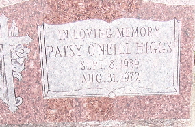 | HIGGS, Patsy (O'NEILL) | Sept. 8, 1939 | Aug. 31, 1972 | Inscription: "In Loving Memory" - Research Note: First wife of Franklin D. Higgs. Possible daughter of Bernard Thomas O'Neill and Lillie Mae Davis. | Headstone Cheryl Note Phyllis Long Photo Fred and Neoma Sherman |