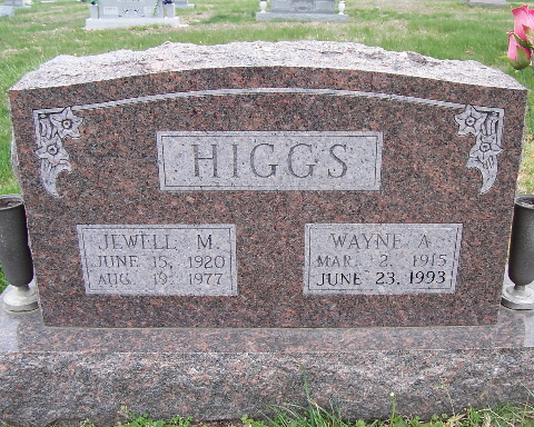 | HIGGS, Jewell M. (JONES) | June 15, 1920 | Aug. 19, 1977 | SSW: Wayne A. Higgs - Research Note: She was the daughter of James and Amanda Jones. | Headstone Cheryl Census Phyllis Long Photo Fred and Neoma Sherman |
