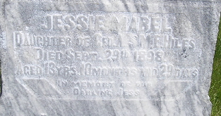 | HILES, Jessie Mabel | Abt. 1885 | Sept. 29, 1898 | Inscription: "Dau. of George A. and M. E. - Age 13 YS, 10 MS, 29 DS - IN MEMORY OF OUR DARLING JESS" - Research Note: Daughter of George A. Hiles and Mary Elizabeth Chamberlain. | Note Phyllis Long Photo Fred and Neoma Sherman |