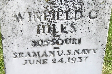 Inscription: "MISSOURI SEAMAN US NAVY" - Research Note: He was a son of George A. Hiles and Mary E. Chamberlain. - Cassville Republican, July 1, 1937 - W.C. (Winn) Hiles, who lived at Exeter when he was a young man, died Friday at his home at Gordon, Ark. He died suddenly. Winn, as his many friends here about his old home knew him, was here on a visit, nearly every year with his mother, Mrs. Mary Hiles who died a few months ago at Exeter, and his sister, Miss Hattie Hiles, who had lately been at Gordon with her brother. Mr. Hiles had been sick for sometime. His two sisters, Mrs. Lottie Haynes of California, and Miss Hattie Hiles were with him during his illness. They and Mr. Haynes accompanied his body back to Exeter for the funeral and burial. The Funeral services were conducted by Mrs. Claude Miller of Monett, a Christian Scientist. The Hiles family are of the Christian Science faith. Burial was in the Maplewood cemetery at Exeter. The Christian Science service was given. Pall bearers were: John Ellston, Earl Smithson, A.L. Walker, John Hughes, A.D. Taylor, and Jess Walker. Surviving him are his widow, one daughter, and two sisters Mrs. Lottie Haynes and Miss Hattie Hiles. - Winfield C. Hiles, age 31, married Nora V. Rogers, age 20, on Mar. 28, 1919 in Jackson Co., MO. | Online Obit MO Marriage Records Phyllis Long Photo Fred and Neoma Sherman |