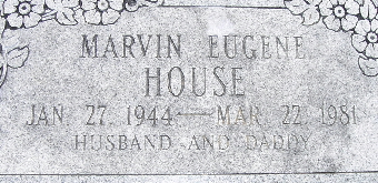 | HOUSE, Marvin Eugene | Jan. 27, 1944 | Mar. 22, 1981 | Inscription: "Husband and Daddy" - Research Note: Marvin, age 23, married Linda Carolyn Jones, age 20, in Neosho, Newton Co., MO. Son of Gene Charles House and Gladys Cleo Smalley. | MO Marriage Records Mother's Obit Phyllis Long Photo Fred and Neoma Sherman |