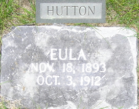 Inscription: "Eula" - Research Note: In Hutton family plot. Daughter of Kim and Emma Hutton. - She was a daughter of Kim Hutton, born Troy, MO, and Emma Jeffries, born Lynn Creek, MO. The cause of death was typhoid fever. | Headstone Carl Henson Death Certificate Phyllis Long Photo Fred and Neoma Sherman |