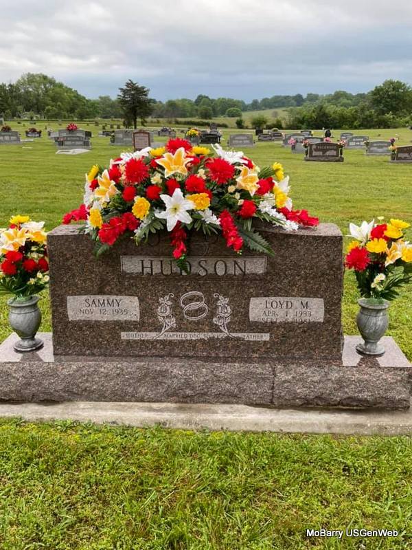 SSW: Sammy - Inscription: "Married Dec. 30, 1956" - Research Note: Lloyd M. Hudson was the son of Charles Joseph Hudson and Iva Morris. Killed in a one car accident. - Loyd M. Hudson, 48, Exeter, RR 1, was pronounced dead at the scene of an accident involving his truck at 1:30 a.m. Saturday on Hwy MM south of Exeter. According to MO Highway Patrol reports, Mr. Hudson was traveling north on MM, and lost control on his vehicle. He had lived in the area most of his life and was a farmer and dairyman. Survived by his wife, one son, three daughters, four brothers, three sisters, and one grandchild. - Another Photo - Military Stone - Inscription: "US ARMY" | SS Claims Index Obit Phyllis Long Photo Jenny Hobbs Thomas Photo Fred and Neoma Sherman |