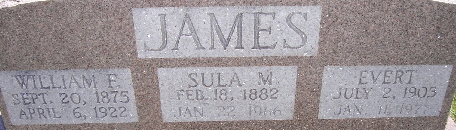 | JAMES, William F. | Sept. 20, 1875 | Apr. 6, 1922 | SSW: William Evert and Sula M. - Research Note: He was the son of Francis Marion James and Malissa Jane Price. | Census Phyllis Long Photo Fred and Neoma Sherman |