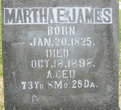 | JAMES, Martha E. | Jan. 20, 1825 | Oct. 18, 1892 | Inscription: "Aged 73 YR 8 MO 28 DA" | Photo Fred and Neoma Sherman |