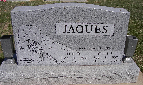 | JAQUES, Ina Belle (REESE) | Feb. 11, 1912 | Oct. 30, 1999 | SSW: Carl - Inscription: "Married Feb. 14, 1931" - Research Note: Ina Reese, age 19 of Washburn, Barry Co., MO, married Carl Jaques, age 24 of Cassville, Barry Co., MO, on Feb. 14, 1931 in Benton Co., AR. She was the daughter of Albert S. and Isabelle Reese. | AR Marriage Index Census Phyllis Long Photo Fred and Neoma Sherman |