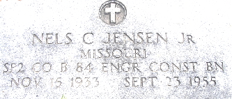 Inscription: "MISSOURI SP2 CO 2 84 ENGR CONSTR BN" - Research Note: Rozella M. Jensen applied for his military stone. He was in service at the time of his death. Stationed at Fort Ord, CA. Son of Nels Chris Jensen Sr. and Rozella M. Carroll. | Military Headstone Application SSDI CA Death Index Phyllis Long Photo Fred and Neoma Sherman |