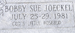 | JOECKEL, Bobby Sue | July 25, 1981 | July 29, 1981 | Inscription: "God's Little Rosebud" | Photo Fred and Neoma Sherman |