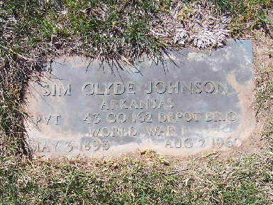 SSW: Agnes - Research Note: He was a brick layer and his wife was Agnes Box. Usual address was 1208 West St., Joplin, MO. Son of Jake Johnson and Mat Bowen. Mrs. Agnes Johnson of Joplin, MO was the informant on the death certificate. - Military Stone - Inscription: "Sim Clyde Johnson, ARKANSAS PVT 43 CO 162 DEPOT BRIG - WORLD WAR I" | Death Certificate Phyllis Long Photo Fred and Neoma Sherman |