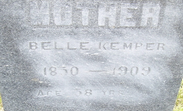 | KEMPER, Sarah Isabelle "Belle" (TAYLOR) | 1850 | 1909 | Inscription: "Mother" - Research Note: Wife of Ruben Cornelius Kemper. Daughter of George Winfield Taylor and Mary Ellen Biddlecome. Belle married Reuben Kemper on Aug. 15, 1869 in Lawrence Co., MO. | Census MO Marriage Records Phyllis Long Photo Fred and Neoma Sherman |