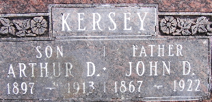 SSW: Arthur D. - Inscription: "Father" - Research Note: John D. Kersey married Anne F. Wasson on July 1, 1891 in Barry Co., MO. - He was married and in the merchandise business. Son of Arthur Kersey and Nancy Hinton both born TN. His wife, Annie Kersey, was the informant on the death certificate. - Wheaton Journal, Friday, July 14, 1922 - John Kersey of Exeter died at his home there Thursday morning at the age of 55 years of heart trouble. He had been afflicted with the trouble for some time. He died very suddenly. He leaves a wife and several children to mourn his death. Mr. Kersey has been in the mercantile business at Exeter for a number of years and has resided there for about thirty five years. He is well known and highly respected citizen of that section. Son of Arthur L. Kersey and Nancy Caroline Hinton. His wife was Anna Frances Wasson, died 1952, buried in Pueblo, CO. - Kersey Memories - Photo of John - Photo of Anna - Photo of Anna and unknown lady | Obit Family Photos Patricia Henry MO Marriage Records Death Certificate Phyllis Long Photo Fred and Neoma Sherman |