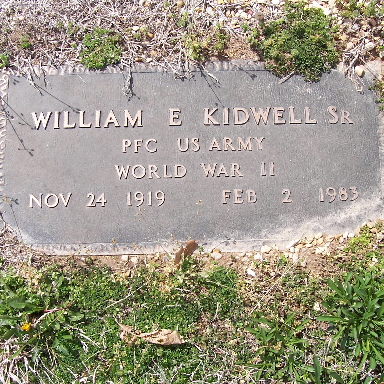 Research Note: William enlisted in WW II on June 16, 1944 at Fort Leavenworth, KS. He was the son of William Kidwell and Cora Swope. - Military Stone - Inscription: "PFC US ARMY - WORLD WAR II". | WW II Enlistment Records WA Birth Records Phyllis Long Photo Fred and Neoma Sherman |