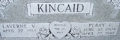 | KINCAID, Perry L. | June 10, 1909 | Apr. 27, 1988 | SSW: Laverne V. - Inscription: "Married Feb. 26, 1947" - Research Note: He was the son of Tillman Kincaid and Eva Lydia Bretz. WW II Veteran. Perry enlisted in WW II on May 22, 1942 and was released on Oct. 20, 1945. | Army Records Census Phyllis Long Photo Fred and Neoma Sherman |