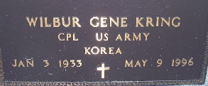 | KRING, Wilbur Gene | Jan. 3, 1933 | May 9, 1996 | Inscription: "CPL US ARMY KOREA" - Research Note: Son of William Raymond and Wilma Christine (Arnold) Kring. Wilbur G. Kring, age 23, married Mildred Yvonne Woods, age 19, on Mar. 23, 1956 in Cassville, Barry Co., MO. | Census MO Marriage Records Phyllis Long Photo Fred and Neoma Sherman |