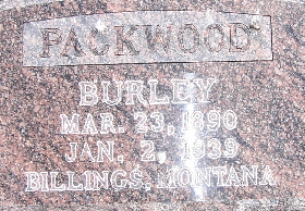 Inscription: "Billings, Montana" - Research Note: Wheaton Journal, Jan. 12, 1939 - Burley Packwood, son of Napoleon B. and Sarah A. (Weatherly) Packwood, born at home on Shoal Creek on March 23, 1890, and departed this life at Billings, Montana, on Jan 2, 1939, at the age of 48 years, 9 months and 10 days. His early boyhood days were spent at home, but at about the age of 15 years he went to the West and spent most of his remaining life there. He came to Missouri occasionally to visit his parents and other relatives. His last visit was in the spring of 1937. He had been in failing health lately, but was planning to visit his mother again next spring. He was married to Evelyn Palmer at Billings, Mon., and to this union five sons were born. He was preceded in death by one son, two brothers and his father. He leaves to mourn his passing his wife and four sons who are Burley, Jr., in college at Doberman, Montana and Palmer, Delbert and Otis of Billings, also his aged mother Sarah A. Packwood of Exeter, Mo., and four brothers, Horace, Arthur and Roy of Exeter, Rolla of Kansas City and two sisters, Mrs. Oma Roller of Seligman, Mo., and Mrs. Mamie Barnett of Exeter, and many other relatives and friends. The remains were brought to Exeter where funeral services were held at the Baptist Church on Saturday afternoon, Jan. 7, 1939, by Rev. Chas. McNabb and Rev. Chas. Vanzandt, with burial in Maplewood Cemetery at Exeter under the direction of the Koon Funeral Home. The following nephews of the deceased were acting pall bearers: E. E. Lauderdale, V. N. Barnett, W. A. Packwood, Sterling Barnett, Carl Roller and Eston Packwood. - July 3, 1913, Thursday, Cassville Republican - Hazel Dell News: Burley Packwood left last week for North Dakota. - Cassville Democrat, April 24, 1920 - Barley Packwood of Billings, Montana, is visiting his many relatives in the vicinity of Exeter. The Democrat acknowledges a pleasant call. | Obit Donna Cooper Online Newspapers Phyllis Long Photo Fred and Neoma Sherman |