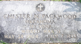 Inscription: "OKLAHOMA - SH USNR - WORLD WAR II" - Research Note: Cassville, MO, July 9. - The body of Chester N. Packwood, 49 years old, of Los Angeles, who was killed Tuesday night in a five-car collision on a Los Angeles traffic way, will be returned to Exeter for graveside services and burial at 11 o'clock Saturday morning in Exeter Cemetery. Surviving are his parents, Mr. and Mrs. J. W. Packwood of Exeter; two sons, Frank L. Packwood, in the army, and James Packwood, Long Beach, CA; five sisters, Mrs. Clara Sallee of Exeter, Mrs. Monta McKee of Raton, NM, Mrs. Mae Mathis of Plainview, TX, Mrs. A.T Stein of San Francisco and Mrs. Fannie Davis of Okmulgee, OK, and three brothers, Walter Packwood of Kansas City, Ivy Packwood of Long Beach and Ed Packwood of Phoenix, AZ. Donna Cooper's Research Note: Culver Funeral Home gave the information about his birth, death and parents, that is listed here. V. 5, P. 115, by Ted Roller. Also that record reads that he was divorced and that he had lived in the community for 16 years - meaning the Los Angeles, California area and that he was killed on the Hollywood Freeway. He was the son of Jesse W. Packwood and Amanda C. White. | Obit Susan Ostrander Mabry Photo Fred and Neoma Sherman |
