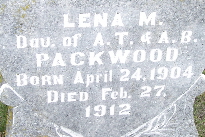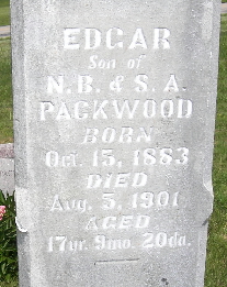 | PACKWOOD, Edgar B. | Oct. 15, 1883 | Aug. 5, 1901 | Inscription: "Son of N. B. and S. A. Aged 17 Yr, 9 Mo, 20 da" - Research Note: He was the son of Napoleon B. Packwood and Sarah A. Weatherly. | Note Phyllis Long Photo Fred and Neoma Sherman |
