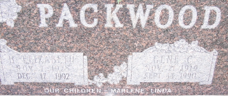 | PACKWOOD, Gene C. | Nov. 21, 1919 | Sept. 14, 1990 | SSW: Elizabeth H. - Research Note: Eugene "Gene" was the son of Elbert Benjamin Packwood and Edith Eva Ellis. | Census Phyllis Long Photo Fred and Neoma Sherman |