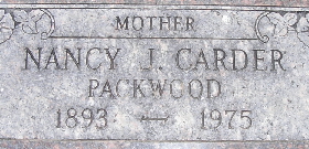 | PACKWOOD, Nancy J. (CRIDER) (CARDER) | 1893 | 1975 | Inscription: "Mother" - Nancy Carder, age 58, married John Emmett Packwood, age 71, both of Exeter, MO, on Nov. 8, 1951 in Benton Co., AR. His first wife was Maude Brattin. Nancy's first husband was George C. Carder. Their son, George Loren Carder is buried at Maplewood Cemetery. Daughter of James Polk Crider and Nancy Adeline "Addie" Ahart. | AR Marriage Records Census Phyllis Long Photo Fred and Neoma Sherman |
