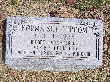 | PURDOM, Norma Sue | No Date | Oct. 1, 1953 | Inscription: "Infant daughter of Jackie Francis and Martha Maxine (Risley) Purdom" | Photo Fred and Neoma Sherman |