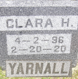 | YARNALL, Clara H. (HIGGS) | Apr. 2, 1896 | Feb. 20, 1920 | Research Note: Cassville Republican, Feb. 28, 1920 - Miss Clara Higgs was born April 2, 1896 and was a daughter of Mr. John and Mrs. Ona (Anna) Higgs of the well known family by that name of this county, and died Feb. 20, 1920 of flu pneumonia, aged 23 years, 10 months and 18 days. On Feb. 8, 1911 she and R. O. Yarnall were married and two children, Wilma and Ruth were born and they with the husband survive her. Her parents and three brothers, three sisters and many relatives and friends are mourning because of her departure. - Clara Higgs, age 17, married Otto Yarnall, age 19, on Feb. 8, 1914. J. M. Higgs and T. B. Yarnall, parents of above named give consent in writing to said marriage. - She was the daughter of John Monroe Higgs and Dicey Ann/Anna Duncan. - February 12, 1914, Thursday, Cassville Republican - A double wedding occurred Sunday at the home of J. M. Higgs north of Exeter, the parties being Otto Yarnall and Miss Clara Higgs and Edward Zuspann and Miss Zula Higgs, Rev. Chas. Vanzandt performed the ceremony that united the two couples in the happy bonds of matrimony. These young people come from excellent families and they enjoy the esteem of a large circle of friends. - Cassville Democrat, March 6, 1920 - Mrs. Otto Yarnall who died recently near Cassville was a niece of Mrs. Noah S. Ford. | Obit Barbara Erwin MO Marriage Records Census Online Newspapers Phyllis Long Photo Fred and Neoma Sherman |