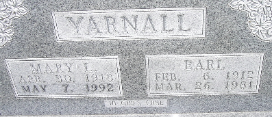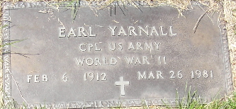 | YARNALL, Earl | Feb. 6, 1912 | Mar. 26, 1981 | SSW: Mary L. - Research Note: He was the son of William Henry Yarnall and Mary Katherine Wooten. - Military Stone - Inscription: "CPL US ARMY - WORLD WAR II" | Census Phyllis Long Photo Fred and Neoma Sherman |