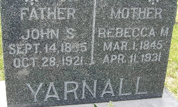 SSW: Rebecca M. - Research Note: He was the son of Joseph Yarnall and Asenthia Slack. Civil War Veteran - Co. D, 1st MO INF, served from Aug. 15, 1861 to Nov. 1864. John filed for his pension on May 13, 1873 from Kansas. Rebecca filed for her widow's pension on Nov. 12, 1921 from Missouri. | 1890 Vet Census Pension Records Census Phyllis Long Photo Fred and Neoma Sherman |