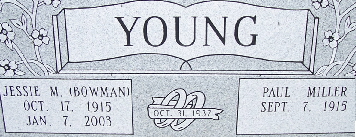 | YOUNG, Jessie Mable (BOWMAN) | Oct. 17, 1915 | Jan. 7, 2003 | SSW: Paul Miller - Research Note: She was the daughter of Edgar Overton Bowman and Bessie L. Austin, both buried at Maplewood. | Census Phyllis Long Photo Fred and Neoma Sherman |