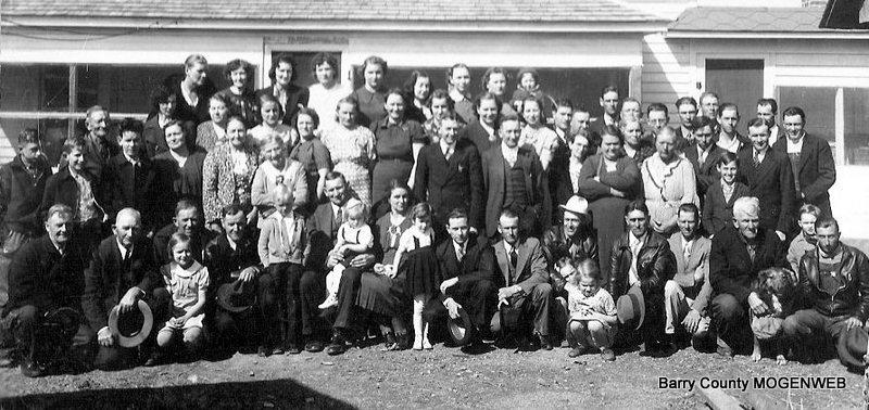 Phyllis said, I got this from Neva Stephens, wife of Ralph E. Stephens who is deceased. On the back it reads, “Made March 12, 1939 - From Mr. and Mrs. C. R. "Bob" Sapp and family. The only identified people are Ralph Stephens and his father, John Willis Stephens. John Willis Stephens' wife was Faytema (Cargile) Stephens. John Willis Stephens is on the front row, third from the right, is the man in light colored suit. Ralph E. Stephens, son of John Willis Stephens is the little boy, first on the right, on the second row from the front. Descendants of Thomas Newton Sapp and Lucinda Amanda Elam 1 Thomas Newton Sapp b: Nov 07, 1850 in WV m: Feb 09, 1882 in Barry Co., MO d: Mar 02, 1931 in Barry Co., MO Burial: Mt Pleasant Cemetery, Barry Co., MO + Lucinda Amanda Elam b: Nov 26, 1862 in Newton Co., MO d: Dec 13, 1928 in Barry Co., MO 2 Ona Pearl Sapp b: May 16, 1883 in Barry Co., MO d: Jan 23, 1884 in Barry Co., MO Burial: New Site Cemetery, Barry Co., MO 2 James M. Sapp b: Oct 19, 1884 in Barry Co., MO d: Sep 12, 1951 in Barry Co., MO Burial: Maplewood, Exeter, Barry Co., MO +Charlotte Grace Rhea b: Oct. 08, 1888 in Barry Co., MO m: Mar 08, 1908 in Barry Co., MO d: Jan 30, 1968 in Barry Co., MO 2 Sanford Newton Sapp b: Feb 10, 1887 in Barry Co., MO d: Feb 08, 1950 in Hemet, CA Burial: Maplewood, Exeter, Barry Co., MO +Annie Reed b: Apr 12, 1889 in Barry Co., MO m: Dec 06, 1908 in Barry Co., MO d: Nov 04, 1941 in Barry Co., MO Burial: Maplewood, Exeter, Barry Co., MO 2 Clarence Raymond Sapp aka: Bob b: Mar 12, 1889 in Barry Co., MO d: May 21, 1980 in Barry Co., MO Burial: Mt Pleasant Cemetery, Barry Co., MO +Lucinda Ethel Corn aka: Luda b: Sep 19, 1891 in Barry Co., MO m: Aug 07, 1910 in Barry Co., MO d: May 06, 1957 in Barry Co., MO Burial: Mt Pleasant Cemetery, Barry Co., MO 2 Flossie Sapp b: Sep 22, 1891 in Barry Co., MO d: Mar 22, 1977 in Barry Co., MO Burial: Purdy Cemetery, Barry Co. Missouri +James Rosebert Linebarger b: Dec 08, 1889 in Barry Co., MO m: Jan 11, 1911 in Barry Co., MO d: Jan 12, 1976 in Barry Co., MO Burial: Purdy Cemetery, Barry Co. Missouri 2 Elizabeth Sapp b: Apr 17, 1894 in Barry Co., MO +Evan L. Yarnell m: Apr 21, 1912 in Barry Co., MO d: May 12, 1960 2 Inez Sapp b: Mar 1897 in Barry Co., MO +Homer Bayless b: Abt. 1897 m: Oct 25, 1914 in Barry Co., MO Photo Added by Phyllis Long - Chart added by Donna Cooper |