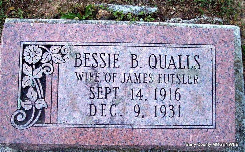 Inscription: "Wife of James Eutsler" - Research Note: Daughter of Henry Qualls, born Stone Co., MO and Gertie Griffith, born Stone Co., MO. Henry Ligalis? was the informant on the death certificate. | Death Certificate Phyllis Long Photo Diana Cope |