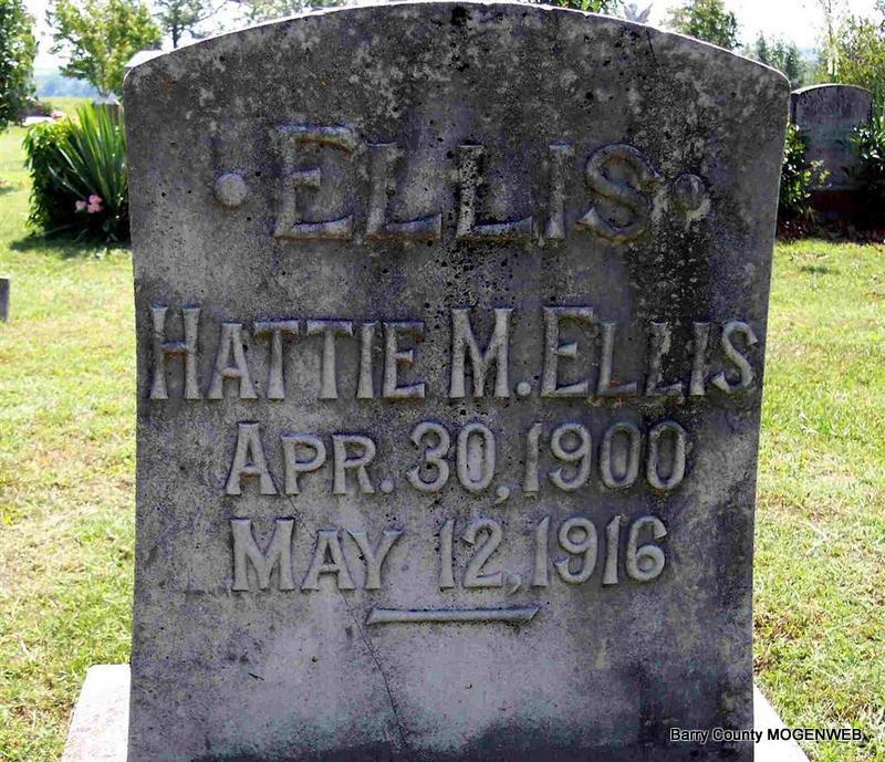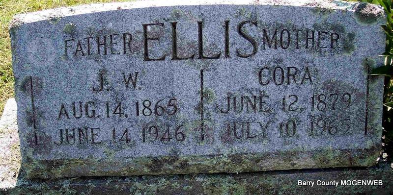 | ELLIS, James W. | Aug. 14, 1865 | June 14, 1946 | SSW: Cora - Inscription: "Father" - Research Note: John R. Ellis and Nancy Jane Wilson. - Cassville Republican, Feb. 22, 1894 - Scholten News: J. O. and J. W. Ellis have moved to Flat Creek and gone into business. | Census Online Newspapers Phyllis Long Photo Diana Cope |