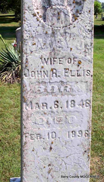 | ELLIS, Nancy Jane (WILSON) | Mar. 6, 1846 | Feb. 10, 1896 | Inscription: "Wife of John R." - Research Note: Daughter of James Matthew Wilson and Delaney Triplett. Nancy Jane Wilson married John Ellis on June 28, 1864 in Barry Co., MO. | Census MO Marriage Records Phyllis Long Photo Diana Cope |
