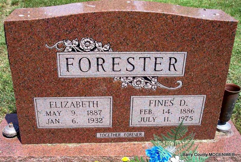 | FORESTER, Mary Frances Elizabeth "Lizzie" (MCCASLIN) | May 9, 1887 | Jan. 6, 1932 | SSW: Fines D. - Research Note: Death certificate has birth date May 9, 1889 and death date Jan. 6, 1933. Daughter of Thomas Jefferson McCaslin. Mother not named on DC. Henry Forester of Cape Fair, MO was the informant. Died of lobar pneumonia. Her mother was Mary Jane Atwell. | King Funeral Home Jay Trace Death Certificate Phyllis Long Photo Diana Cope |