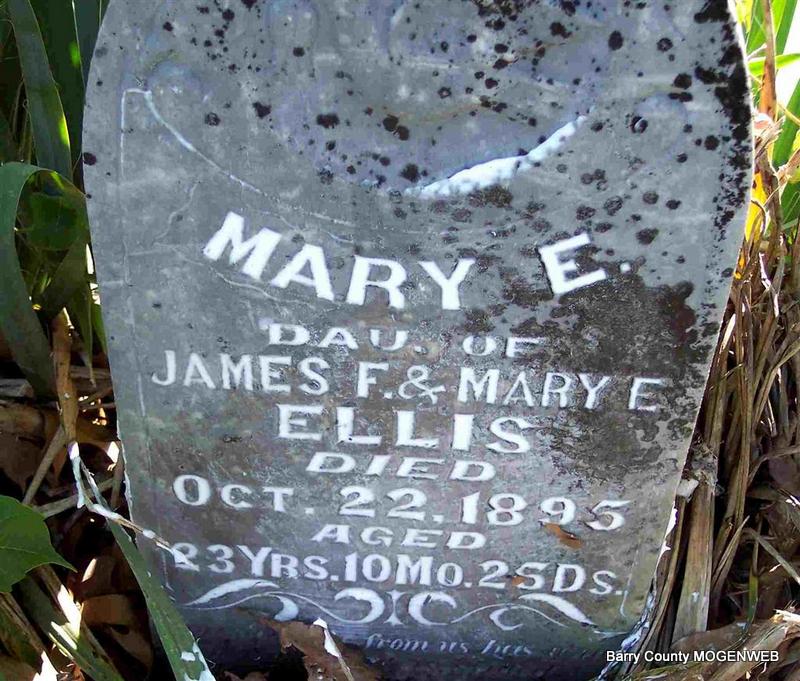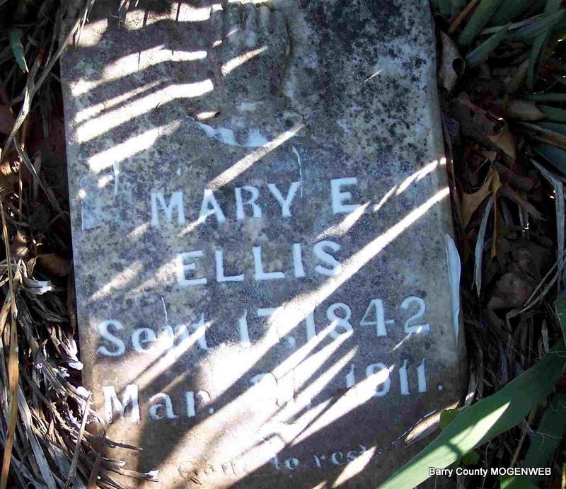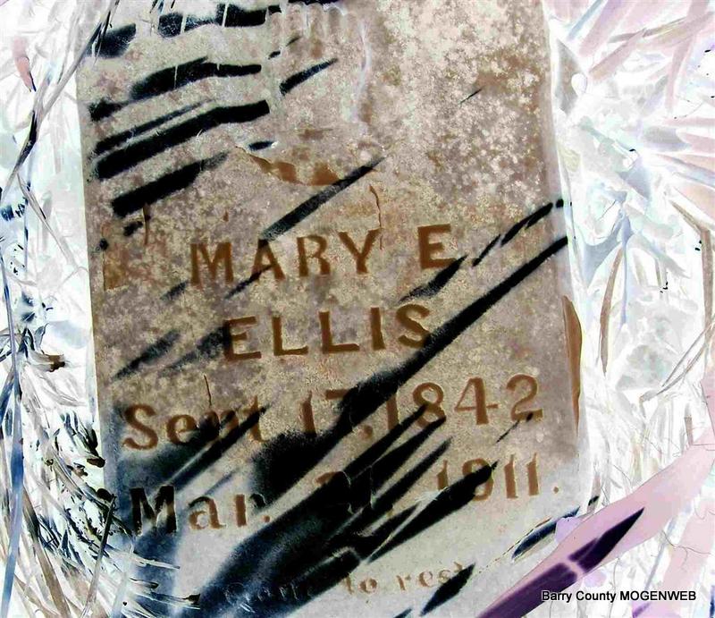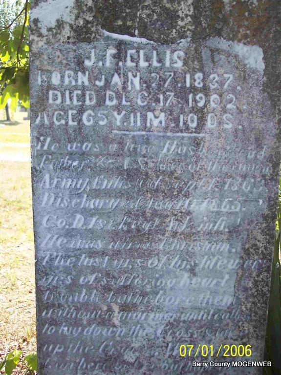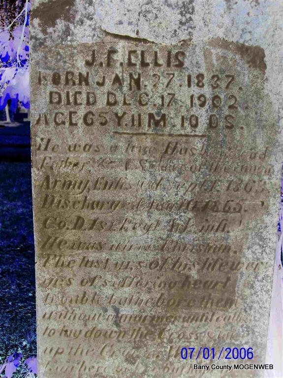 | ELLIS, James F. | Jan. 27, 1837 | Dec. 17, 1902 | Inscription: "Age 65 Y, 11 M, 10 Ds" - Research Note: James Ellis married Mary E. Dunn on July 29, 1858 in Barry Co., MO. - Computer Enhanced Negative | MO Marriage Records Phyllis Long Photo Diana Cope |