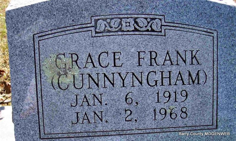 | FRANK, Grace (CUNNINGHAM) | Jan. 6, 1919 Crane, Crane, Stone Co., MO |