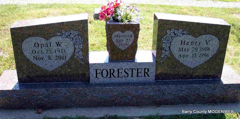 | FORESTER, Henry V. | May 29, 1908 | Apr. 13, 1996 | SSW: Opal W. - Inscription: "Married Feb. 23, 1929" - Research Note: Son of Fines Daniel Forester and Mary Frances Elizabeth "Lizzie" McCaslin. | Census Phyllis Long Photo Diana Cope |