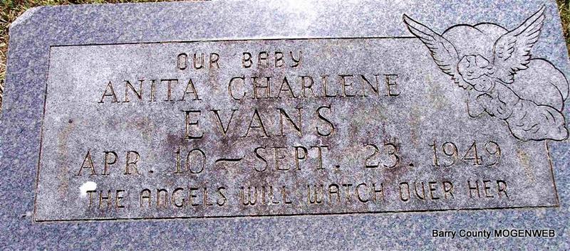 | EVANS, Anita Charlene | Apr. 10, 1949 | Sept. 23, 1949 | SSW: Blanche and Charlie - Inscription: "Our Baby - The Angels Will Watch Over Her" - Research Note: Daughter of Charlie Evans and Blanche Carney. - Another Stone - Back of Stone | Death Certificate Phyllis Long Photo Diana Cope |