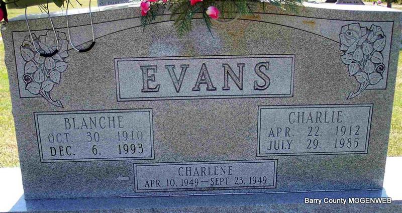 | EVANS, Charles Lester "Charlie" | Apr. 22, 1912 | July 29, 1985 | SSW: Blanche and Anita - Research Note: Son of Robert Franklin Evans and Myrtle Maggie Crouch. - Back of stone | Census Phyllis Long Photo Diana Cope |