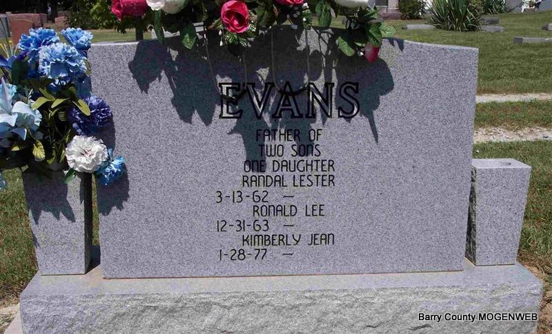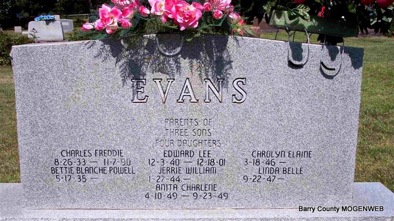 Research Note: Resident of Cave Springs, AR. Son of Charlie Evans and Blanche Carney. He owned and operated Evans Radiator - Cave Springs, AR. His wife was Viola Jean Schnake, divorced in 1990. - Back of Stone | Obit Phyllis Long Photo Diana Cope |