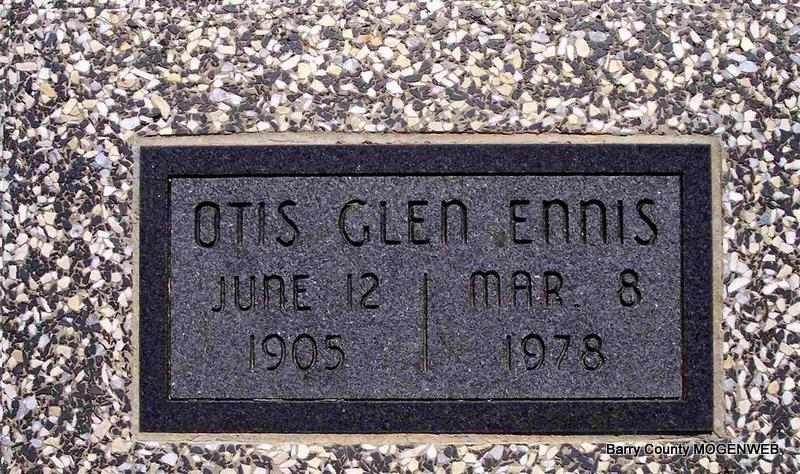 | ENNIS, Otis Glen | June 12, 1905 | Mar. 8, 1978 | Research Note: Son of Thomas F. Ennis and Harriet Alice Hall. His wife was Vida (Wicker) Edwards. | Census Phyllis Long Photo Diana Cope |