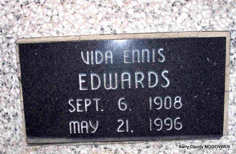 | ENNIS, Vida (WICKER) (EDWARDS) | Sept. 6, 1908 | May 21, 1996 | Research Note: Daughter of Andrew Jackson Wicker and Olive Mira Moreland. Vida J. Wicker married Otis G. Ennis on June 14, 1933 in Galena, Stone Co., MO. | Census MO Marriage Records Phyllis Long Photo Diana Cope |