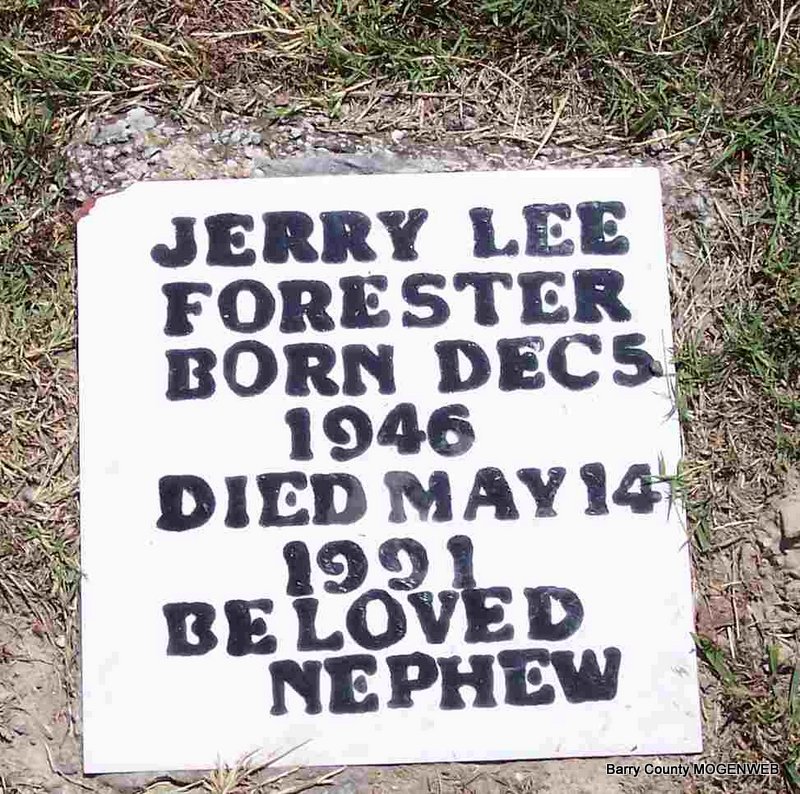 | FORESTER, Jerry Lee | Dec. 5, 1946 | May 14, 1991 | Inscription: "Beloved Nephew" - Research Note: Jerry Lee Forester, age 18, married Jeanie Ann Ellingsworth, age 16, on June 25, 1965 in Aurora, Lawrence Co., MO. Bernice Forester, mother of Jerry Lee and Shirley Ann Woods, mother of Jeanie Ann, gave consent. Jerry Lee Forester, age 32, married Carlotta Lucille Sitton, age 31, on Nov. 30, 1979 in Aurora, Lawrence Co., MO. Jerry Lee Forester, age 38, married Valeri Jean Burkett, age 40, on Oct. 9, 1984 in Barry Co., MO. | MO Marriage Records Phyllis Long Photo Diana Cope |