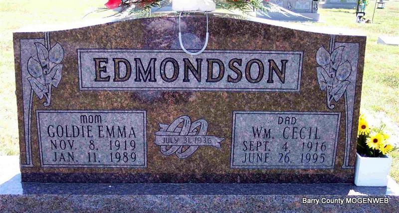 | EDMONDSON, William Cecil | Sept. 4, 1916 | June 26, 1995 | SSW: Goldie Emma - Inscription: "Dad" - "Married July 31, 1936" - Research Note: Son of William and Bessie Edmondson. - Back of Stone | Census Phyllis Long Photo Diana Cope |