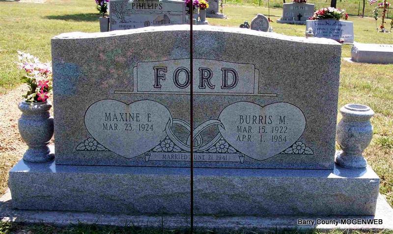 SSW: Burris M. - Inscription: "June 21, 1941" - Research Note: Daughter of Andrew Jackson and Nellie Grace (McKarnin) Barber. Maxine was preceded in death by her parents; her husband, Burris M. Ford of 39 years, in 1984; and her husband, Frank Denning of 15 years, in 2002; three brothers, Willard, Wilson and Duane Barber; and three sisters, Betty Mae Barber, Thelma Hayes and Martha Hoy. For many years, Maxine co-owned the Wheelerville Grocery Store with her husband, Burris, until his death. Eunice Maxine Barber, age 18, married Burris Milton Ford, age 19, on June 21, 1941 in Independence, Jackson Co., MO. | Springfield News-Leader MO Marriage Records Phyllis Long Photo Diana Cope |