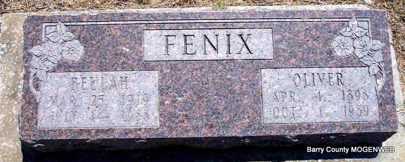 | FENIX, Oliver | Apr. 4, 1898 | Oct. 1, 1989 | SSW: Beulah - Research Note: Son of William Newton Fenix and Mary Ann Hughey. His first wife was Harriet Odean Roller. - Wheaton Journal, December 7, 1939 - Harriett Odean Fenix was born June 18, 1901, and passed away Dec. 1, 1980 at the age of 88 years, 5 months and 18 days. She was a daughter of Jacob Roller, old and highly respected citizen of Barry County. She was united in marriage to Oliver Fenix, Sept. 6, 1919, and to this union three children were born, Alphenia, age 19, Oren, age 16 and Jessie age 12. Burial was made in the family cemetery (Barnes Cemetery) with the Koon Funeral Services in charge. - Second wife was Hazel Imogene Hyde and third wife Beulah. | Online Obit Phyllis Long Photo Diana Cope |