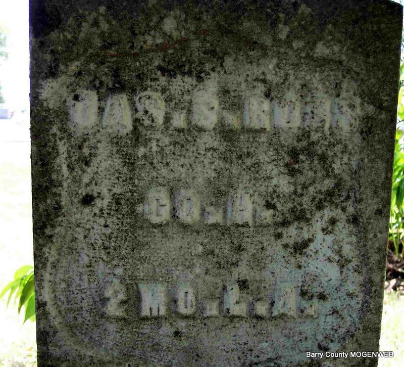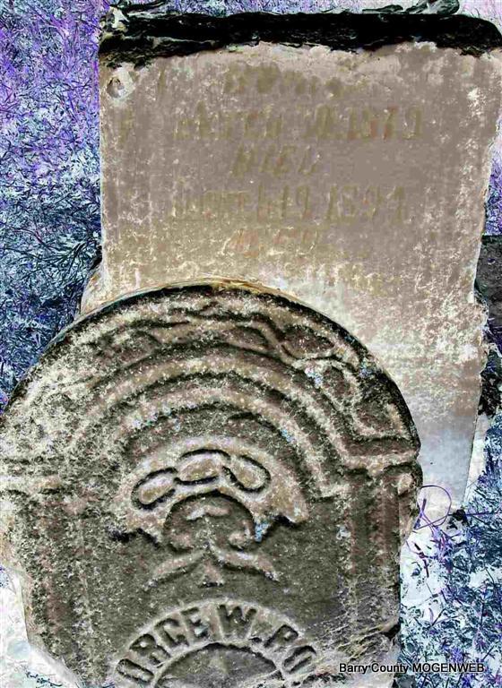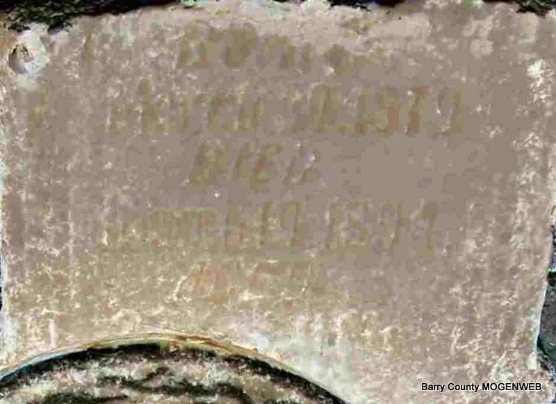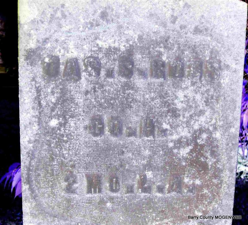 Inscription: "Co A 2 MO L. A." - Research Note: Son of Nehemiah and Eliza Ross. Researchers say his first wife was Martha J. Lasiter. There is a Martha J. Ross, born 1845 and died 1939 buried at Osa Cemetery. Maybe divorced? Married Mary (Downs) Stevison, his second wife, on Apr. 4, 1895 in Cassville, Barry Co., MO. - Census very confusing. Mary Downs married Thomas G. Stevenson/Stevison on Nov. 13, 1887 in Barry Co., MO. James S. Ross, age 51, married Mary Stephen/Stevison, age 23, on Apr. 4, 1895 in Cassville, Barry Co., MO. - 1900 Census, Mountain, Barry, Missouri - gives James S. Ross, born Oct. 1843, age 56, born AR, married 12 years to Martha J. Ross, born Nov. 1844 IL, mother of 5 children, 5 living; Pona E., son, born Jan. 1896 MO, age 4; Wiley C., son, born Nov. 1897 MO, age 3; Joel A., son, born Oct. 1898 MO, age 1; Martha A. Stevison, stepdaughter, born Aug. 1888 MO, age 11; George S., stepson, born Aug. 1889 MO, age 10. - James married Mary, born 1871 according to her stone and marriage record, in 1895. - 1910 Census, Crane Creek, Barry, Missouri - Mary Ross, age 38, widowed, mother of 9 children, 8 living, born IL; Wiley C., son, age 13; Jewell/Joel, age 11, son; Arvil Patrick, age 9, son; Orbie R., age 7, son; William Timothy, age 6, son. - Civil War Pension Records give James S. Ross filed for pension on Apr. 22, 1890. Minor Melvin Ross (Gdn.) filed on Nov. 19, 1906. Martha J. Lee filed as widow on Apr. 5, 1907. Mary Ross, widow, contest. (contested?) on Sept. 22, 1916. - Cassville Republican, Nov. 3, 1906 - Scholten News: Uncle Jim Ross died. His funeral was preached at his home after which the remains were laid to rest in the Mars Hill Cemetery. - Computer Enhanced Negative | Online Obit MO Marriage Records Census Phyllis Long Photo Diana Cope |