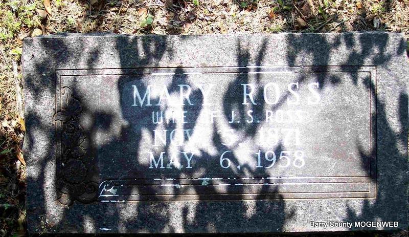 Inscription: "Wife of J. S. Ross" - Research Note: Her first husband was Thomas G. Stevison. Second husband was James S. Ross. Daughter of William Carroll Downs and Elizabeth Jane "Betty" Watkins. Pona Ross (son) of Jenkins, MO was the informant on the death certificate. Mary Downs married Thomas G. Stevenson/Stevison on Nov. 13, 1887 in Barry Co., MO. James S. Ross, age 51, married Mary Stephen/Stevison, age 23, on Apr. 4, 1895 in Cassville, Barry Co., MO. | Death Certificate Census MO Marriage Records Phyllis Long Photo Diana Cope |