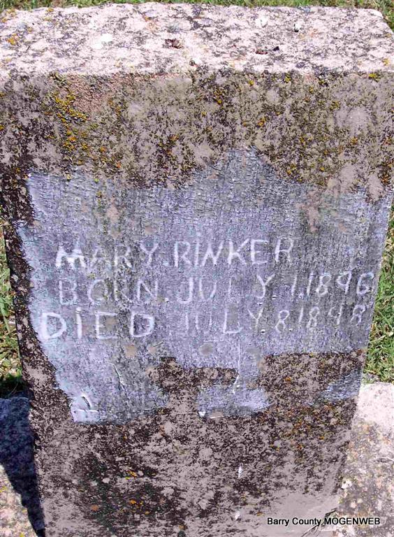 | RINKER, Mary | July 1, 1896 | July 8, 1948 | Research Note: Daughter of Elisha Benton Rinker and Margaret Ellen Bowling. | Census Phyllis Long Photo Diana Cope |